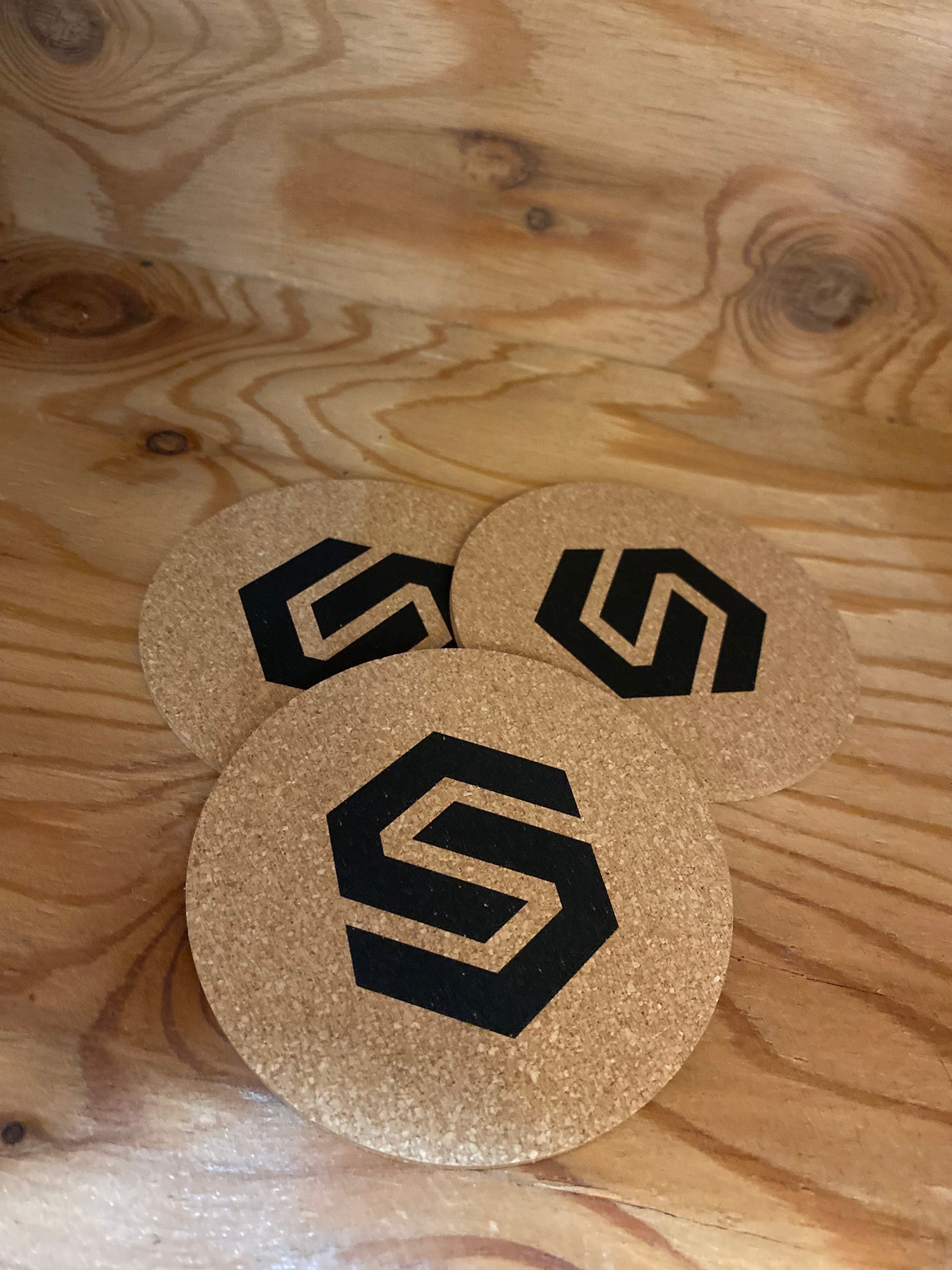 コルク素材を使用したSロゴのコースター。ナチュラルな風合いが特徴で、どんな食卓にもぴったりフィットします。日常的な使用はもちろん、パーティーやアウトドアでの演出にも最適です!