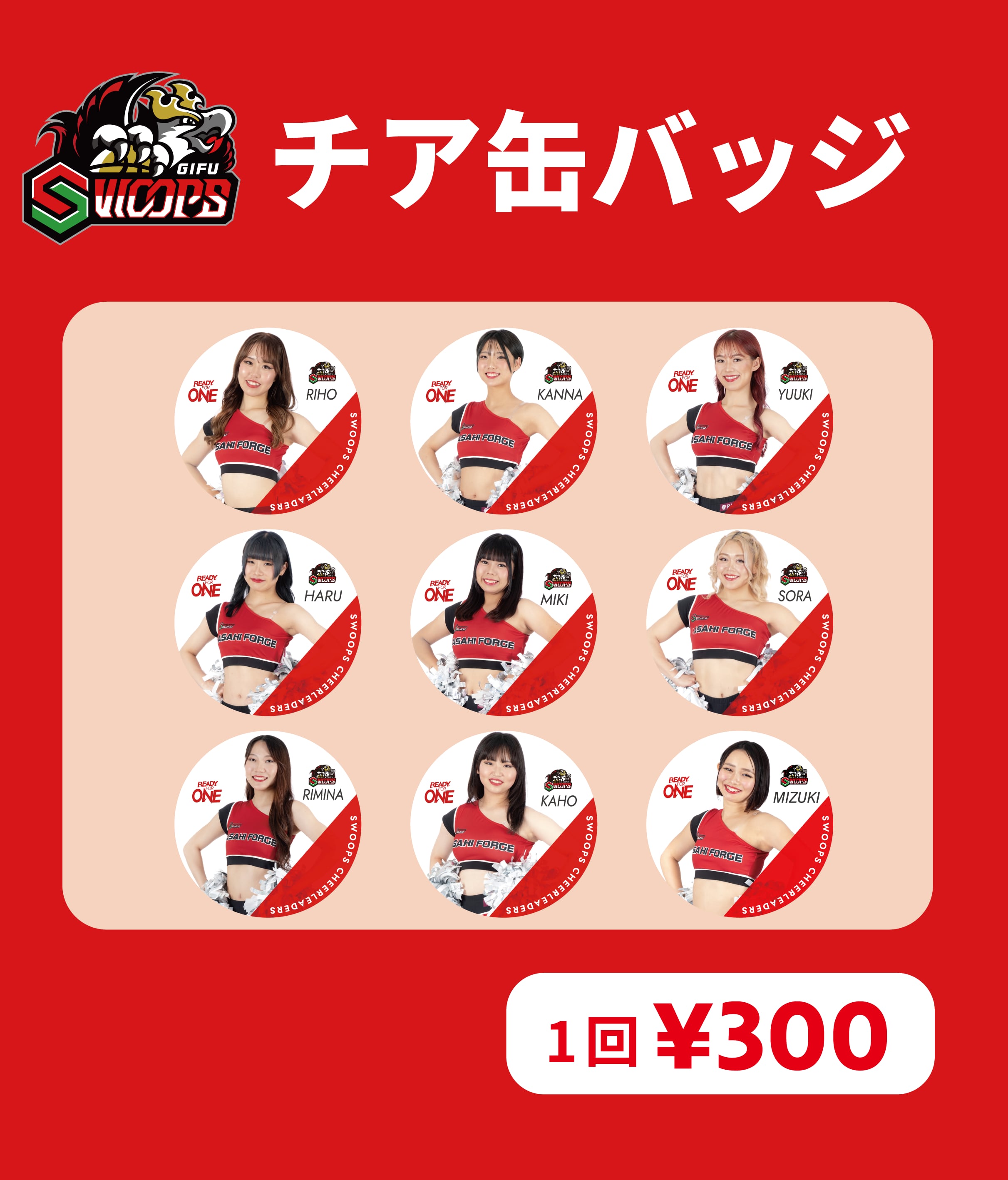 今シーズンの岐阜スゥープスチアリーダーズメンバー9名がデザインされた缶バッジ。